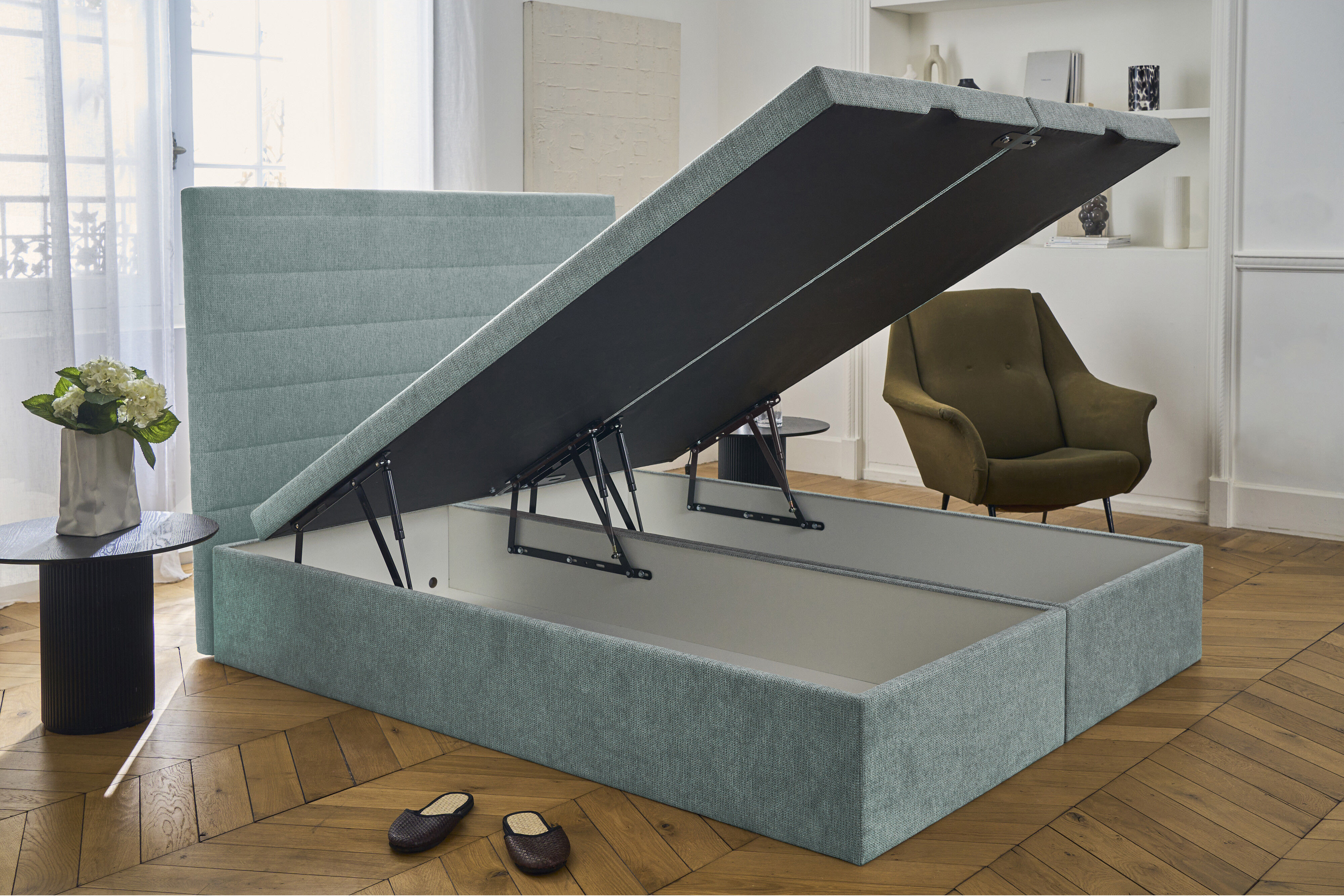 Sommier coffre de fabrication française, conçu pour allier solidité et praticité, intégrant un large espace de rangement discret sous le couchage.